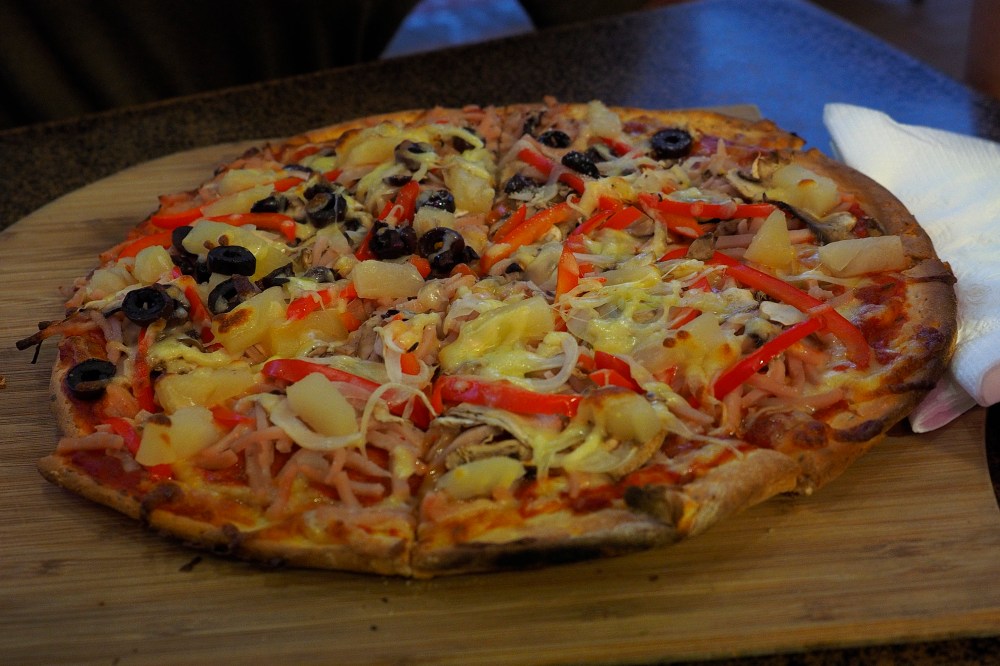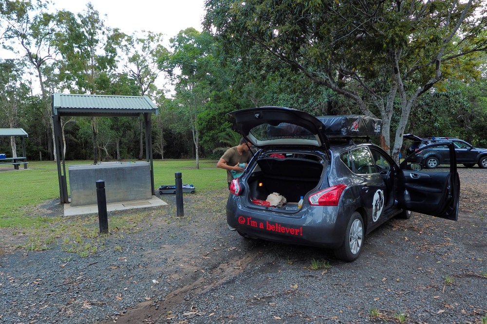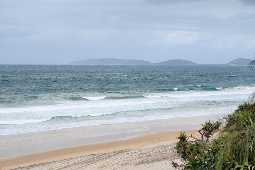 Continuing southbound, we stopped at Rainbow Beach for a dip in the water. This place was great. It was overcast when we arrived and it started to rain when we got down to the shore. The wind picked up a bit too. The water still felt great. We had pizza for dinner at a local eatery with free Wifi. The pizza was great. I loved it. I noticed that a large amount of people there were very physically attractive. After a few hours of charging our devices, we made our way to another campground where we set up camp.