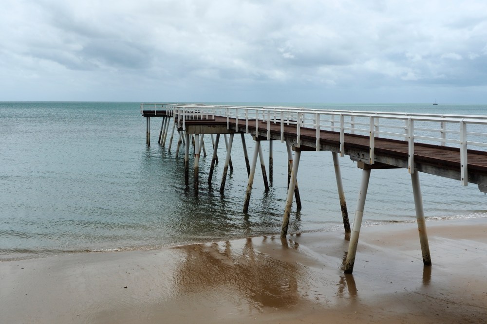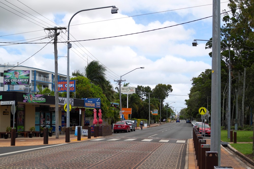 Once the tent was put away and we were all packed up, we continued south to Hervey Bay where Dan and Dave did a workout on the beach while I walked around talking pictures. Hervey Bay is a nice seaside town with a peaceful vibe. We ate at a local fish and chip joint.