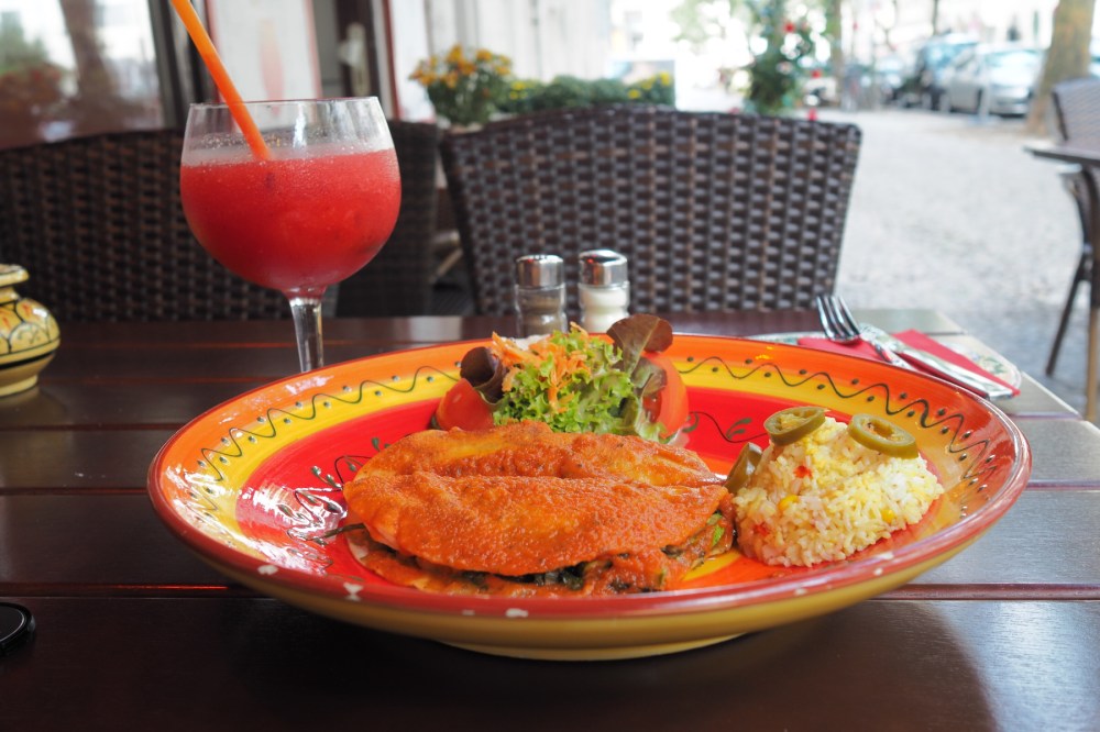 In the late afternoon, after more walking around, I stopped for dinner at a Mexican restaurant in west Berlin. I ordered a frozen strawberry margarita and a vegetarian chimichanga. I suppose the margarita was as good as you could get at a Mexican restaurant in Germany, but the owner of the establishment should probably re-evaluate his/her knowledge of Mexican cuisine. A chimichanga is a deep friend burrito. That is NOT what was served to me. A more accurate description of my dish would be a soft shell taco filled with onion, zucchini, jalapeno, and other vegetables topped with red tomatillo sauce. The presentation was beautiful. It tasted delicious and I would definitely order the dish again……..but it was not a chimicanga.
