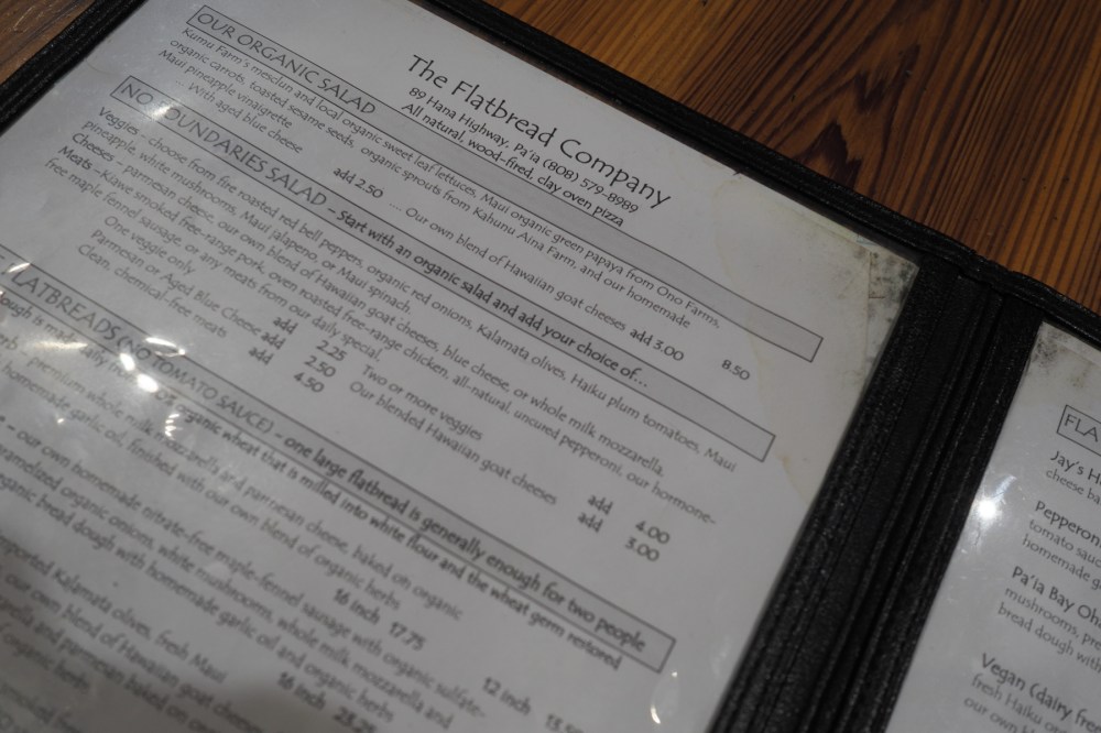 Though there is very little that I don’t like to eat, I am a bit of a pizza junkie. There is no shortage of pizzerias on Maui. My favorite so far is Flatbread Company in Paia. I’ve been to a few other pizza places on the island, such as PI Artisan Pizzeria in Lahaina, but I have very complex tastes in food, and Flatbread Company is more creative in it’s choices.
